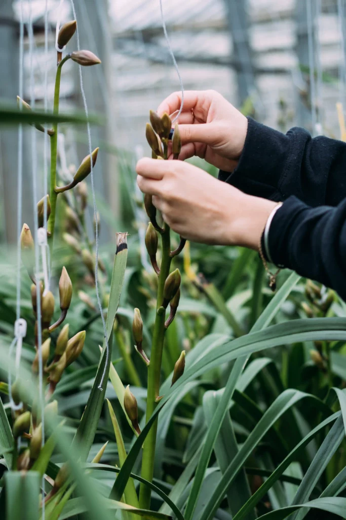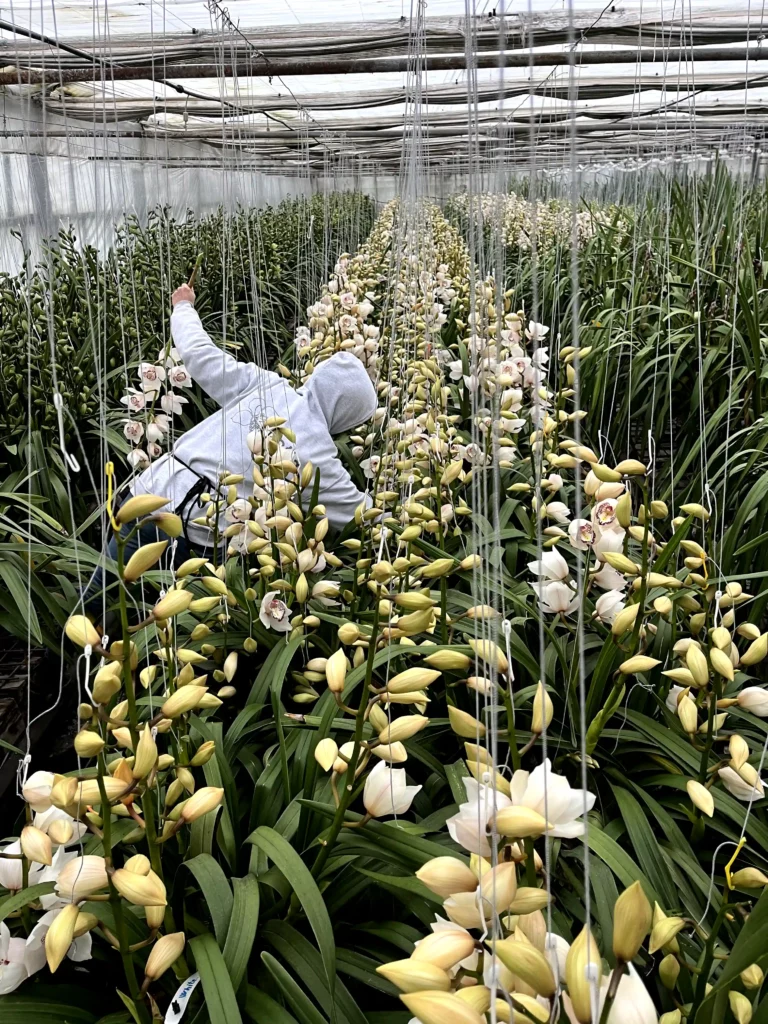 és szaporítják az új állományt. Mivel a bimbótól a virágzásig körülbelül öt hónap telik el, ez idő alatt intenzív kézi munkát igényel. A kertészet dolgozói hetente átvizsgálják az üvegházakat, és a bimbókat felkötözik, hogy azok egyenes szárral fejlődjenek.